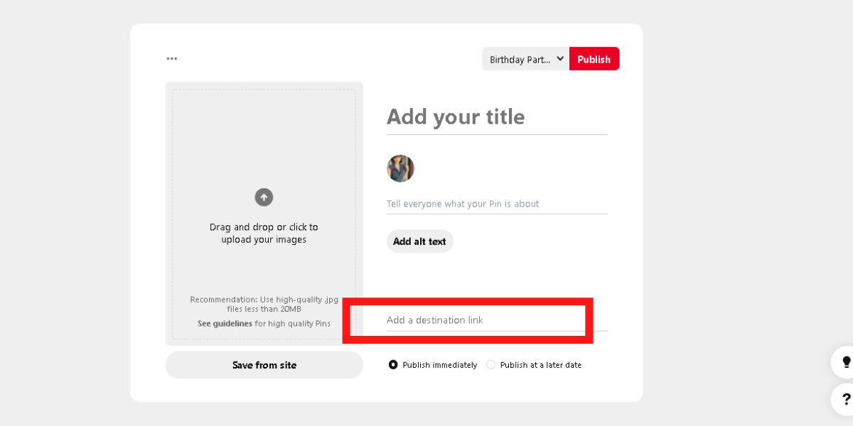 Creating a Pinterest business account is free, and sharing the link to your Etsy store on every Pin you create is easy! All you need to do is click on Create Pin → and Add a Destination Link (which is your Etsy store) at the bottom.Â