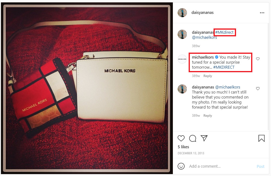 Michael Kors, the famous luxury brand, announced a giveaway for its followers through Instagram DM, asking them to post pictures with the hashtag #MKDirect. This practice made hundreds of people share pictures. A huge amount of user-generated content came into being which gave Michael Kors a huge profit.
