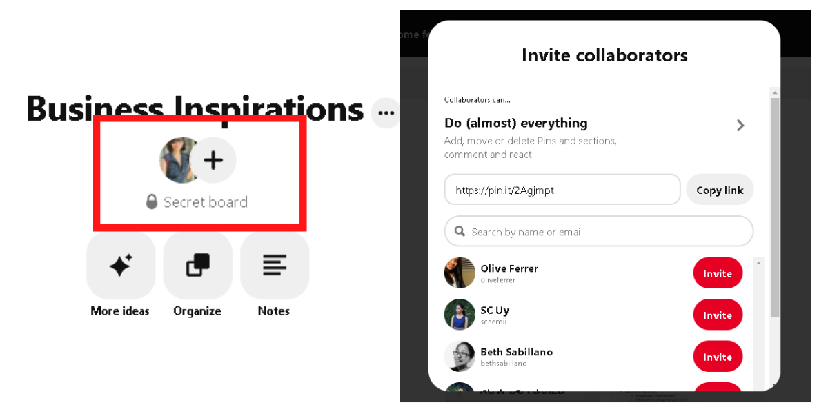 If you’ve created a secret board for your team on Pinterest, you can start adding your team members by clicking on the plus sign just below the board name and next to your profile icon. In the pop-up window, you can add collaborators by entering their first and last name or email address in the search bar or copy the invite link and send to them.